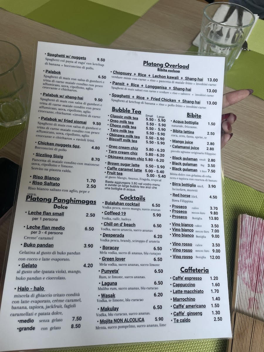 The crispy pork belly stands out, a rare find in Milan, and perfectly complemented by a sweet pandan drink that appeals to those with a penchant for desserts.